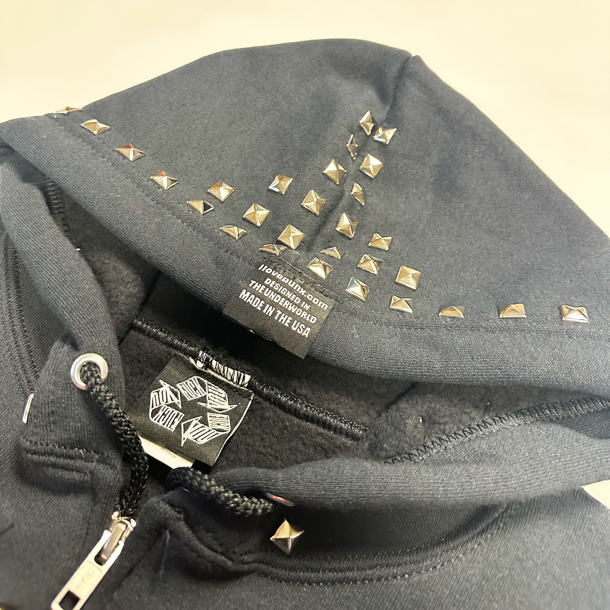 CUSTOM DESIGNED PATCH WORK HOODIE WITH ONE OF ONE PLACEMENT. EACH ONE IS DIFFERENT FROM THE LAST. ALL OF THE PRODUCTS ARE SEWN IN HOUSE AT THE PUNX HEADQUARTERS.