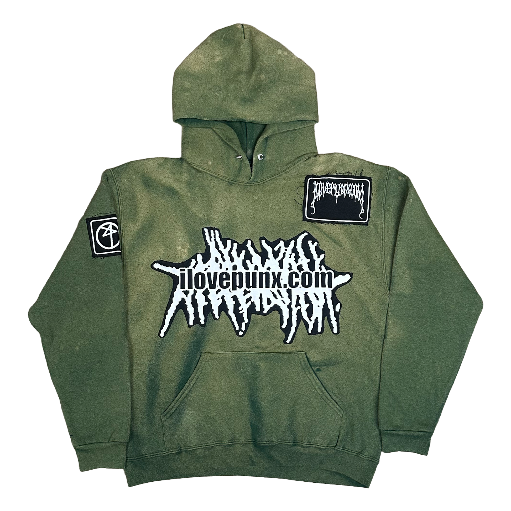 INSANE PUNX SUNBLEACHED HOODIE WITH CUSTOM PUNX PATCHWORK, HAND CUT HAND SEWN AND HOODIE STRINGS REPLACED WITH SPIKES. ONE OF THE BEST WE HAVE EVER MADE.