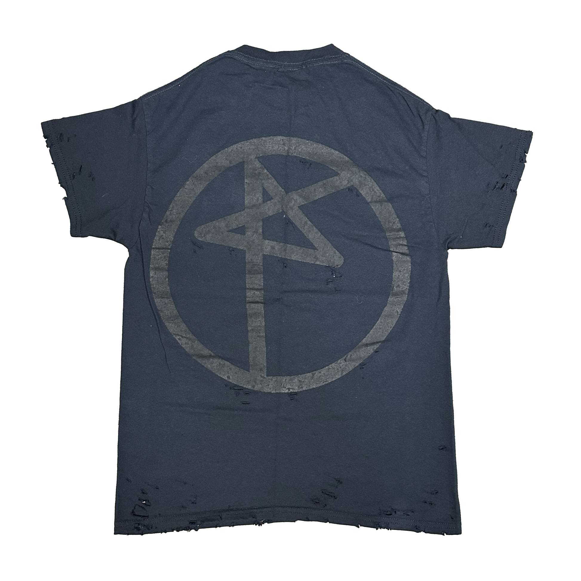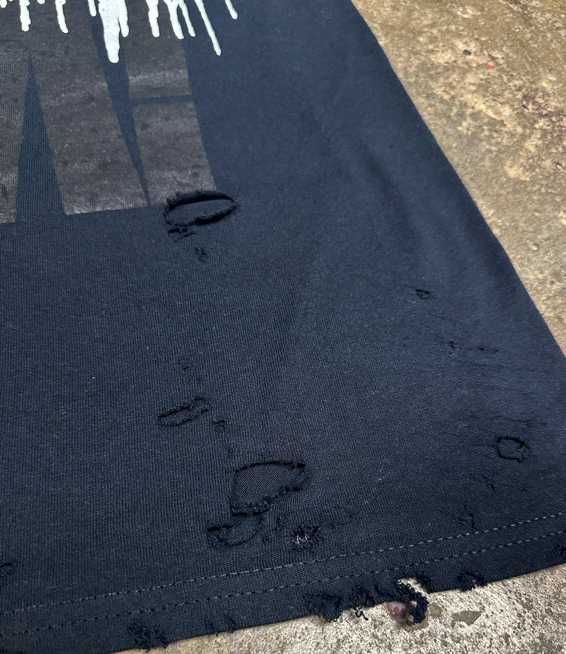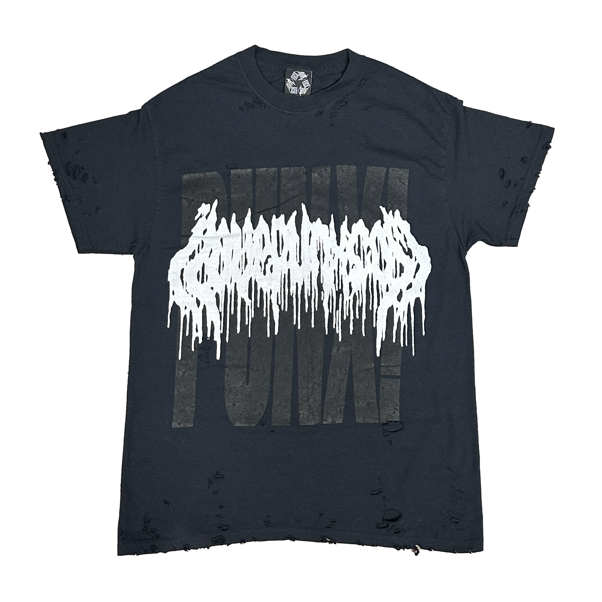 IN COLLABORATION WITH DISCARDED BY GOD, HE HAND DISTRESSED THE TEE TO PERFECTION. ITS A BLACK ON BLACK OG PUNX TEE WITH OUR COLLAB ILOVEPUNX.COM LOGO PRINTED OVER TOP.