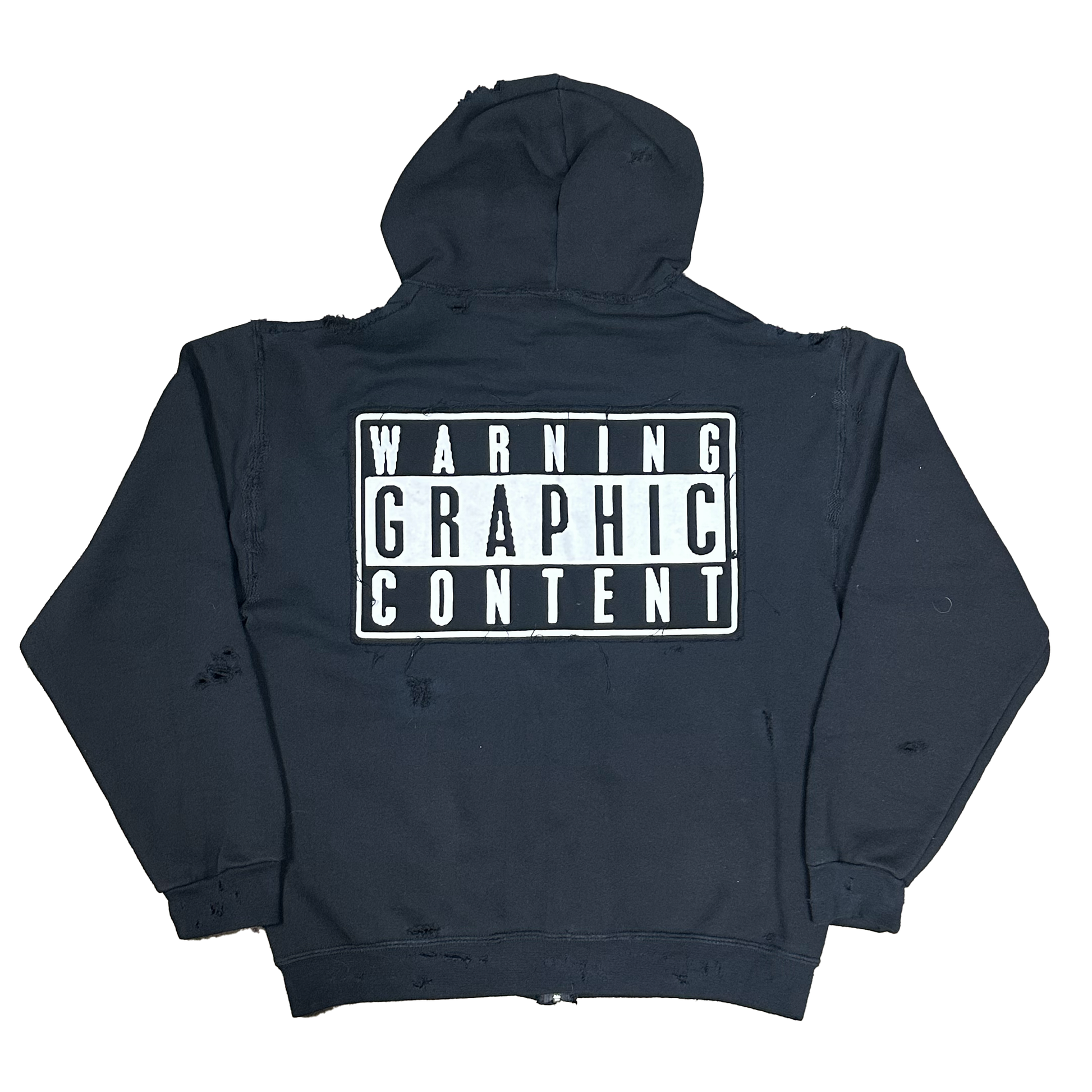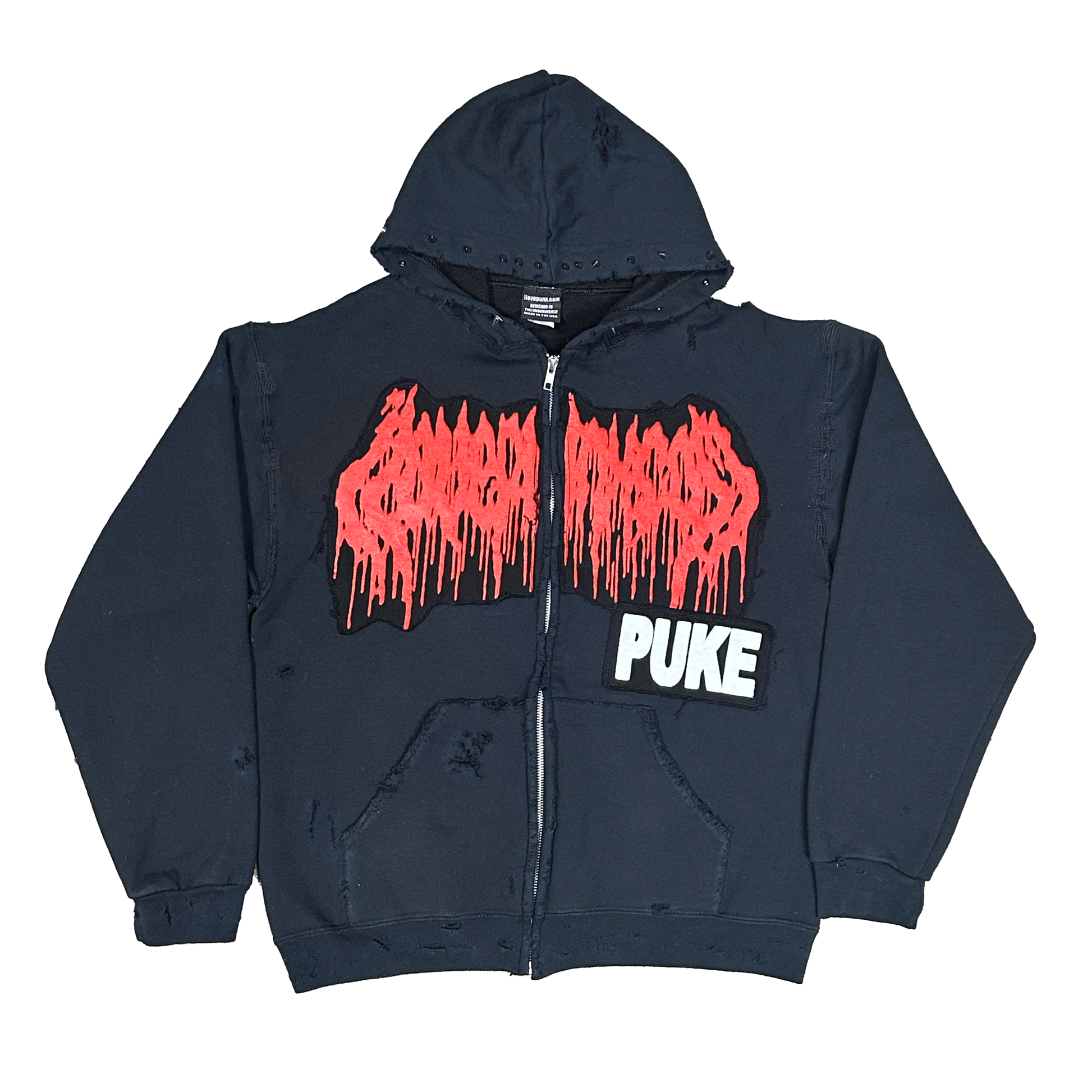 PUNX X DBG 'ILOVEPUNX.COM' GRAPHIC ON A HEAVILY DISTRESSED AND REPAIRED HEAVYWEIGHT ZIP UP HOODIE. HOODIE STRINGS ARE REPLACED WITH SPIKES AND THE WHOLE HOOD IS SPIKED. ALL DISTRESS, REPAIR AND STUD WORK IS DONE BY PUNX IN HOUSE IN THE USA!!!!