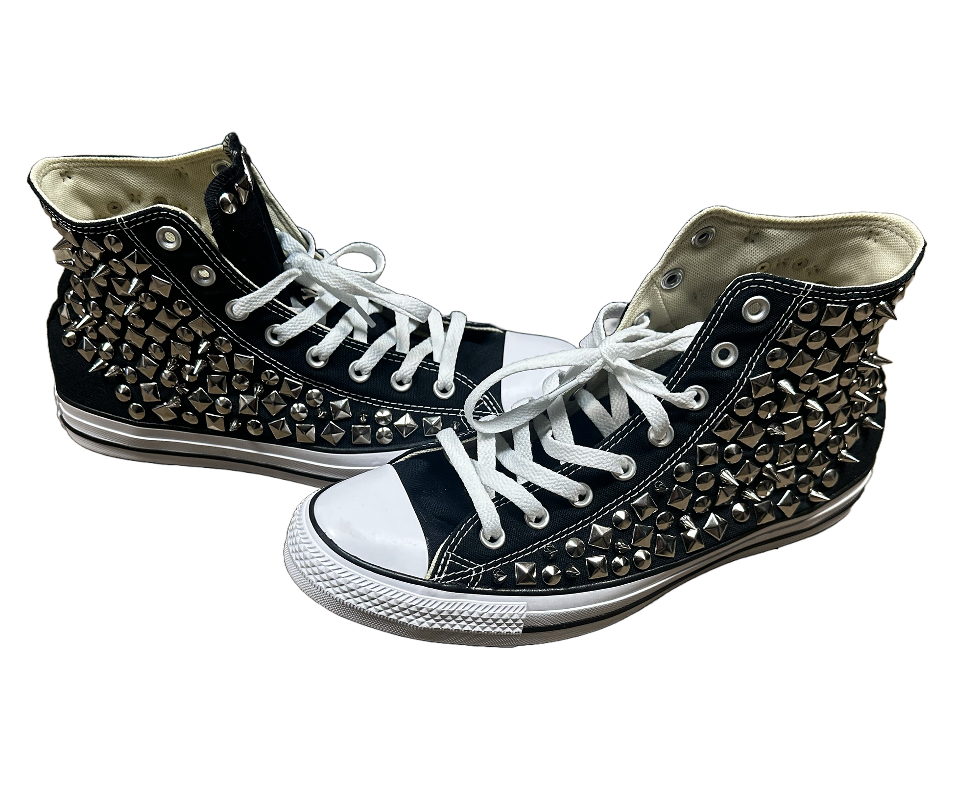 PUNX HAND STUDDED CONVERSE. THESE INSANE KICKS GOT STUDS ALL OVER THEM SPIKES, DOMES, SQUARES ALL THAT SHIT. EACH PAIR IS MADE TO ORDER AND COMPLETELY DIFFERENT. THEY WILL BE SIMILAR TO THE SAMPLE PAIR BUT UNQUIE IN THEIR OWN WAY. EACH PAIR COMES WITH A CUSTOM PUNX BOX AND IS A BRAND NEW PAIR OF BLACK CONVERSE!!!!