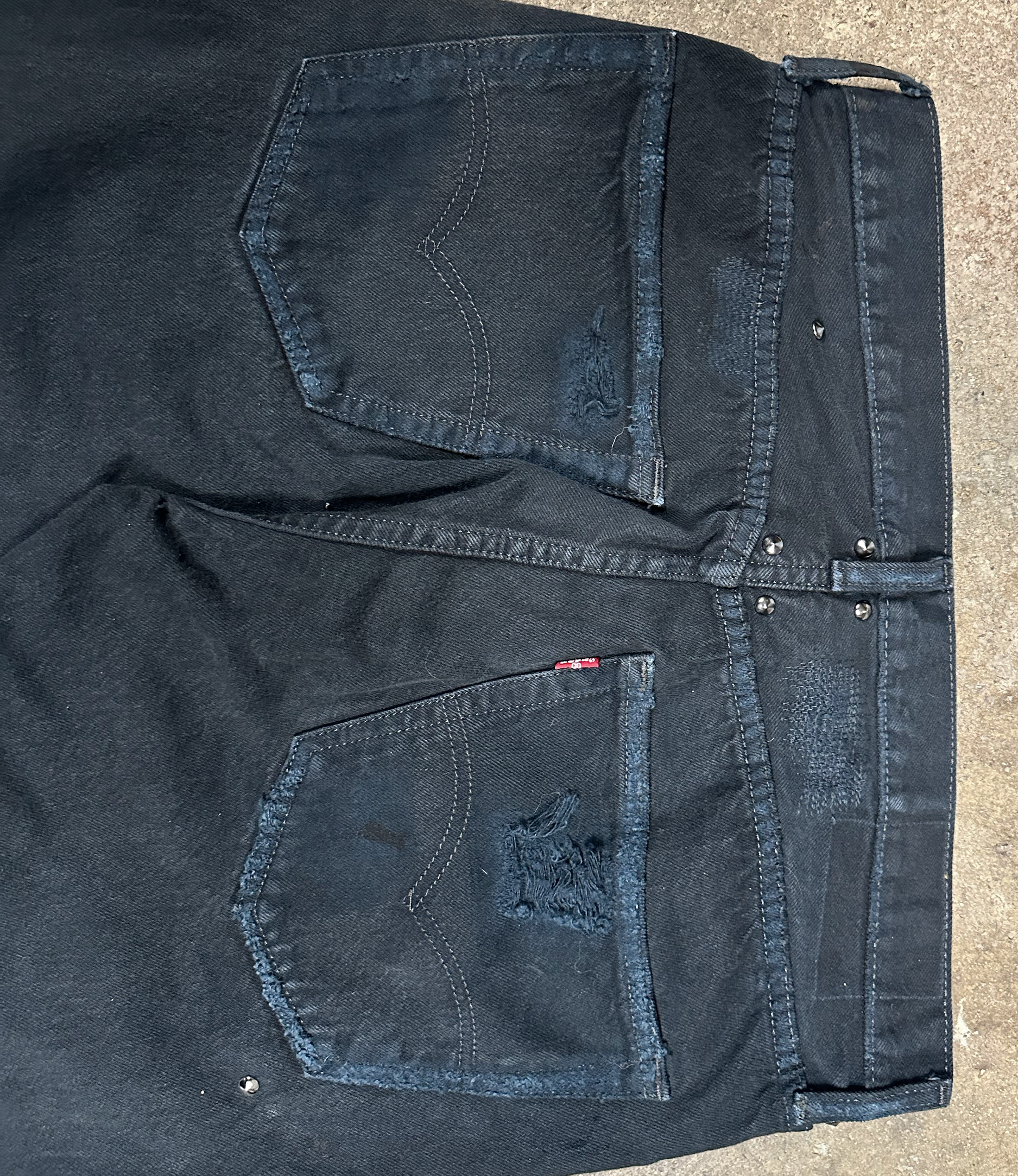 CUSTOM DESIGNED VINTAGE LEVIS JEANS WITH HAND PLACED STAINLESS STEEL STUDS. THESE DENIM HAVE BEEN SHREDDED AND REPAIRED BY PUNX THEN STUDDED WITH GUNMETAL AND BLACK STUDS THROUGHOUT.