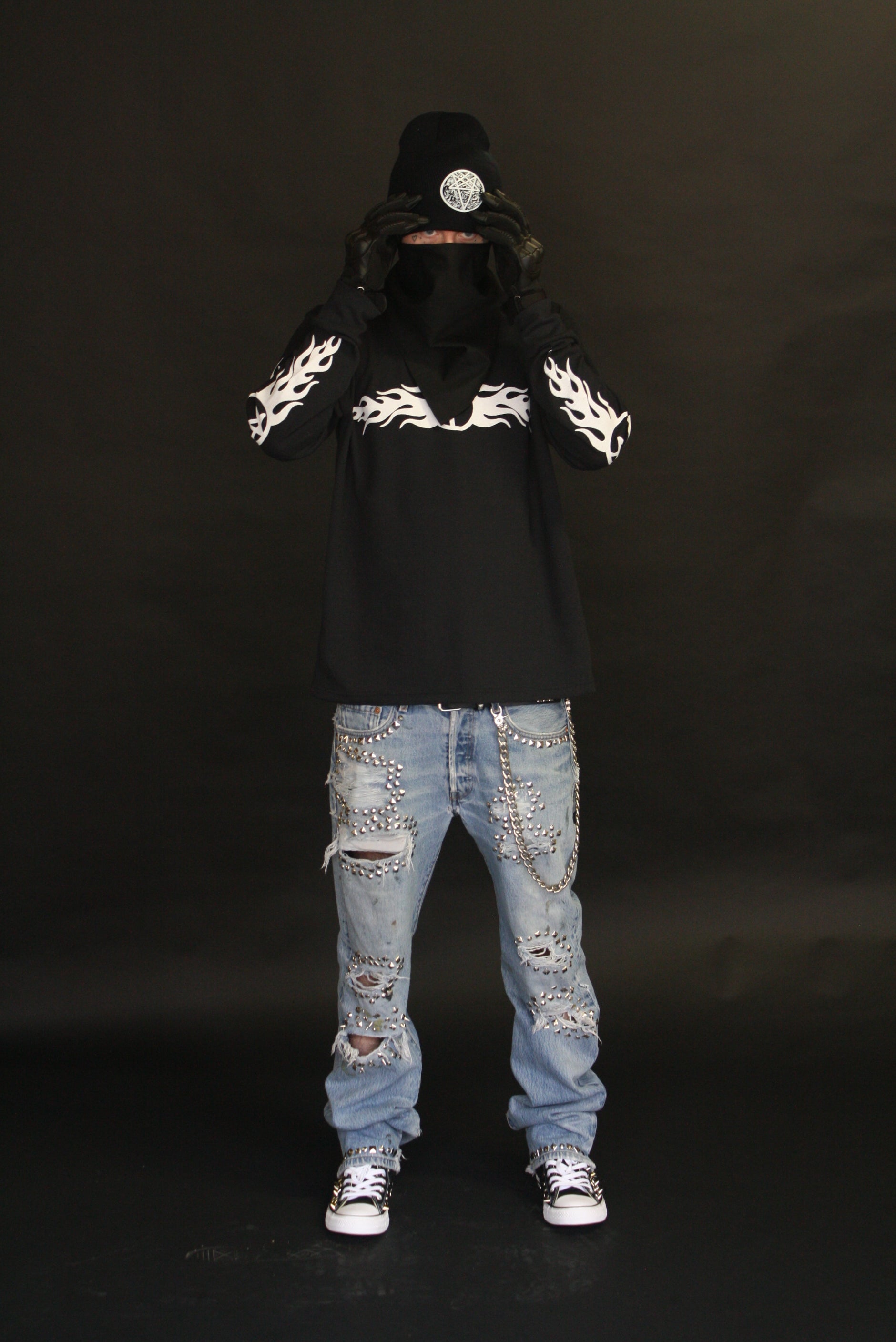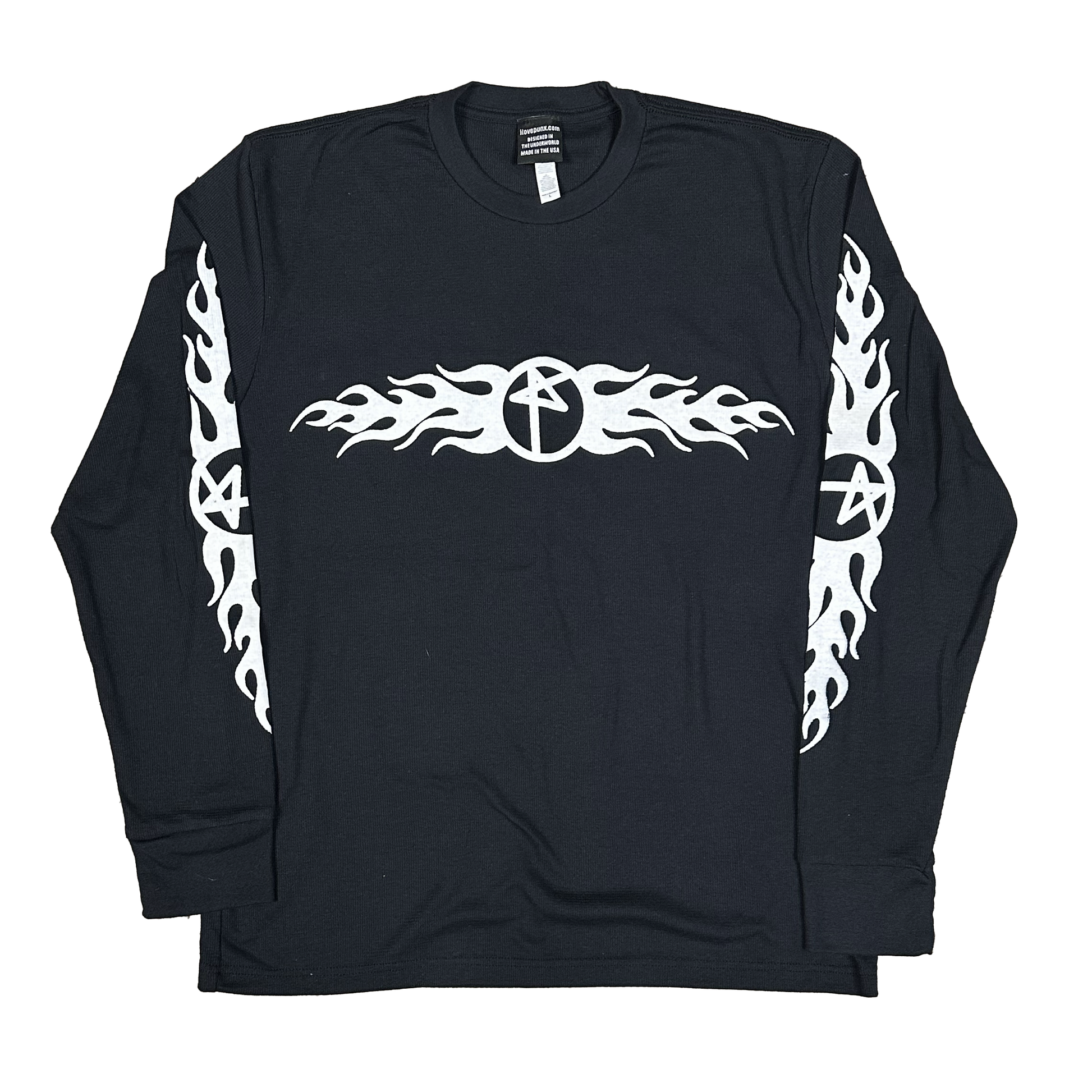 BLACK THERMAL LONG SLEEVE WITH THE PUNX FLAMES DESIGN PRINTED ON THE SLEEVES AND ACROSS THE CHEST. WEAR IT UNDER SHIT OR AS IS.