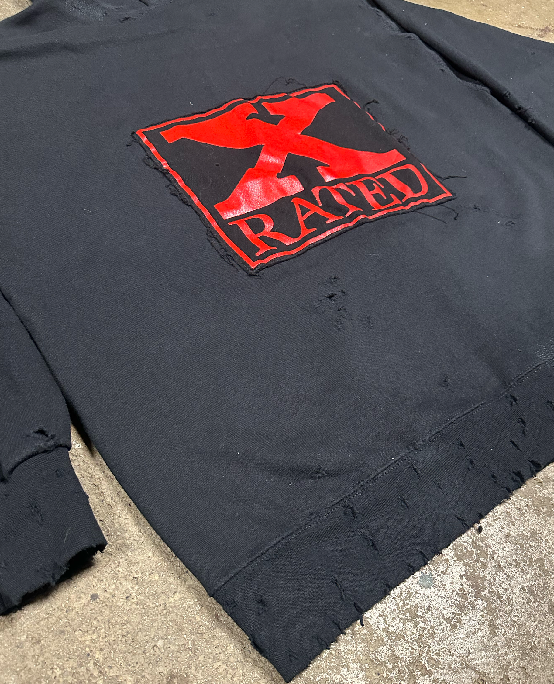 GROUPIE, X RATED & MORE PUNX GRAPHICS ON A HEAVILY DISTRESSED AND REPAIRED HEAVYWEIGHT ZIP UP HOODIE. HOODIE STRINGS ARE REPLACED WITH SPIKES AND MORE SPIKES BY THE PATCH ON THE HOOD. ALL DISTRESS, REPAIR AND STUD WORK IS DONE BY PUNX IN HOUSE IN THE USA!!!!