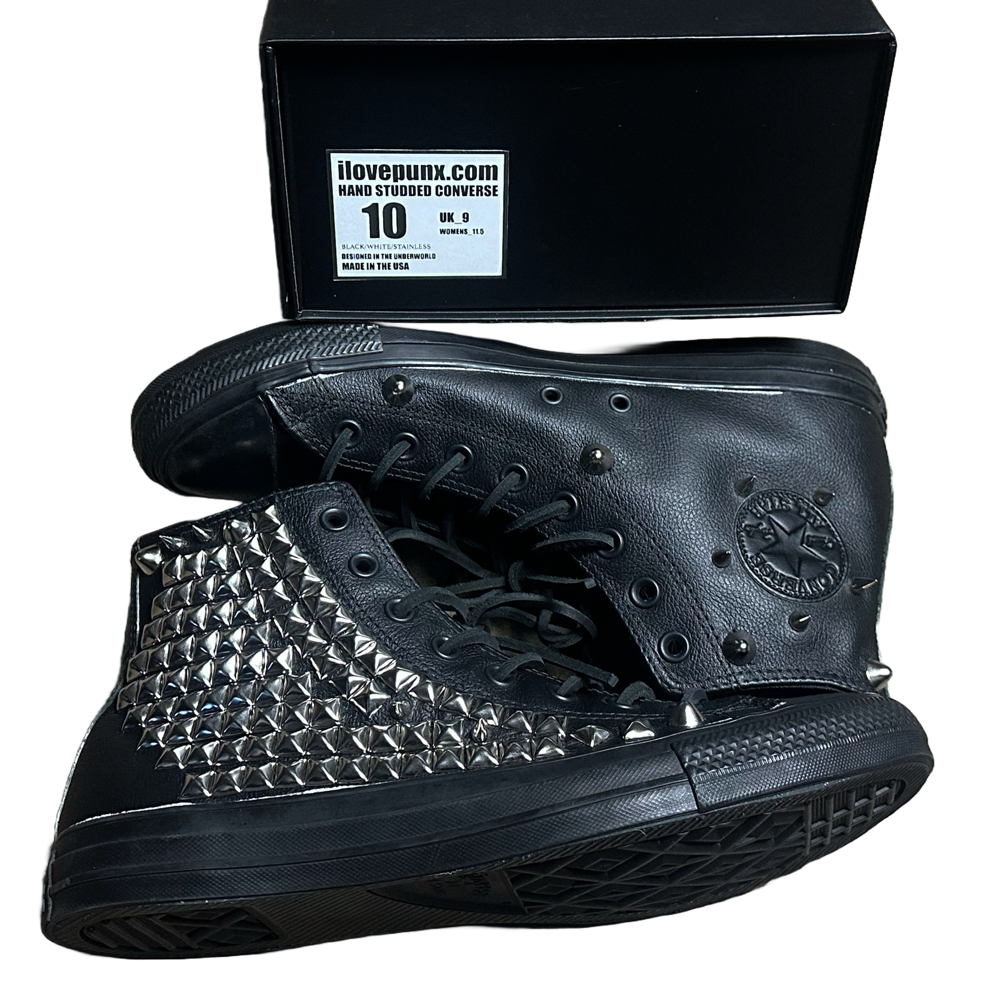 PUNX HAND STUDDED CONVERSE. THESE INSANE ALL LEATHER BLACK CONVERSE HAVE BEEN HAND STUDDED BY PUNX. COVERED IN THREE DIFFERENT TYPES OF STUDS IN A STYLE ONLY PUNX COULD DO. PAIR INCLUDES A CUSTOM PUNX BOX AND TWO PAIR OF LACES ALONG WITH THE BRAND NEW PAIR OF SHOES.