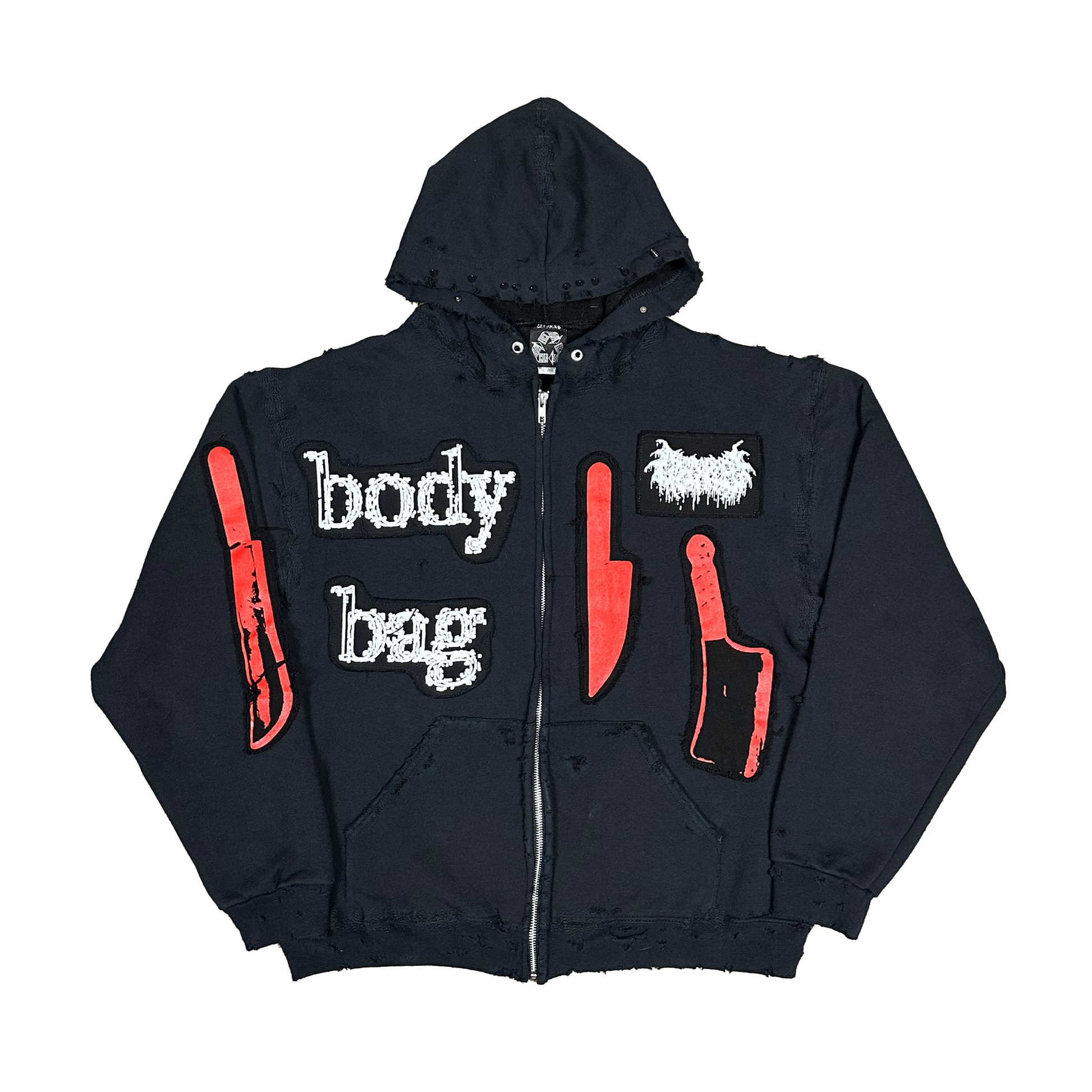 BODY BAG, KNIVES SET WITH ONE ON THE SLEEVE & PUNX X DBG 'ILOVEPUNX.COM' GRAPHIC ON A HEAVILY DISTRESSED AND REPAIRED HEAVYWEIGHT ZIP UP HOODIE. HOODIE STRINGS ARE REPLACED WITH SPIKES AND THE WHOLE HOOD IS SPIKED. ALL DISTRESS, REPAIR AND STUD WORK IS DONE BY PUNX IN HOUSE IN THE USA!!!!