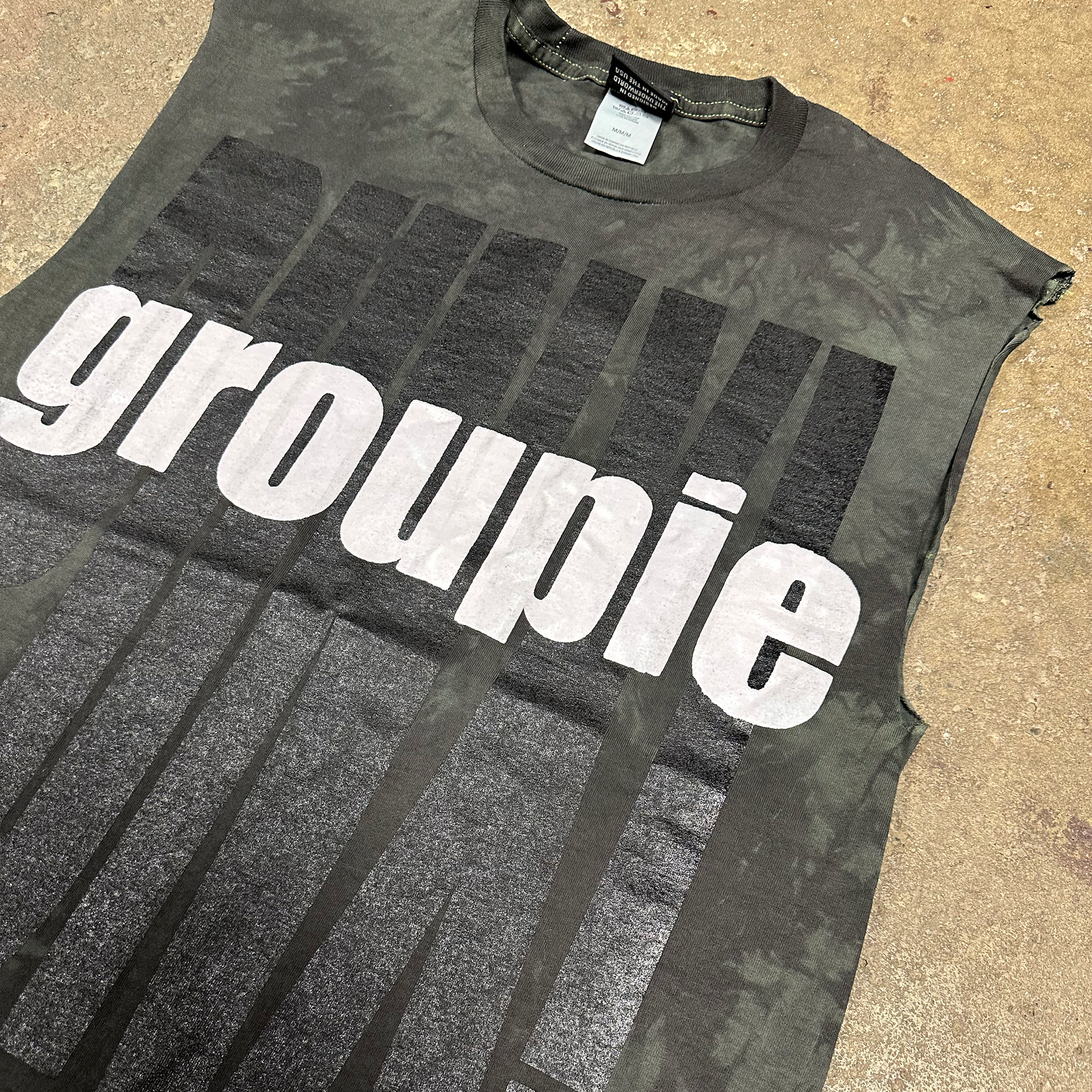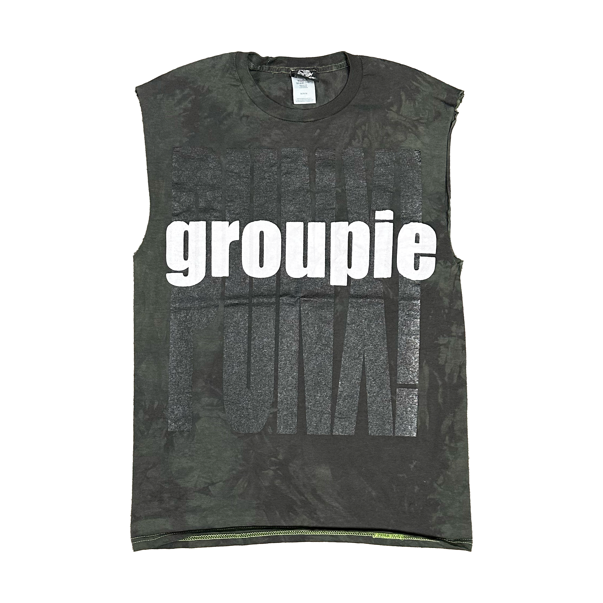 GROUPIE AND FLAMES PRINTED OVER A GREEN OG PUNX TEE. SLEEVES HAVE BEEN REMOVED. FIRE DETAILS AND TEXTURES. REPAIRED SHOULDERS.